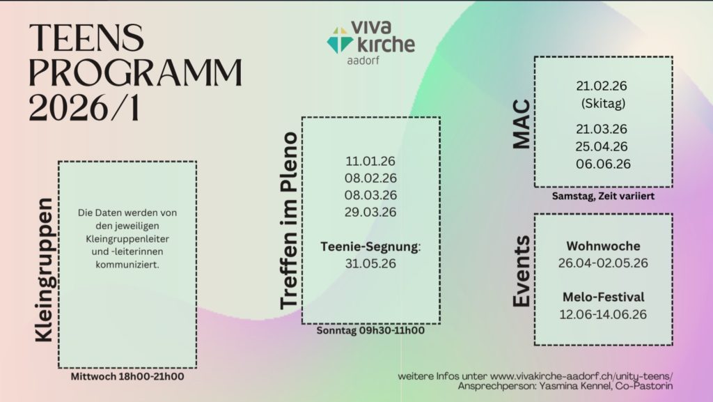 Am Mittwochabend treffen sich die Teens in Kleingruppen. Nach einem gemeinsamen Znacht lesen wir in der Bibel und diskutieren aktuelle Themen rund um Glauben und Welt. Unser Ziel ist, dass die Teens Jesus kennenlernen, seine Liebe erfahren und in ihrer Identität wachsen. Gemeinsam teilen wir Freuden und Herausforderungen und beten füreinander.