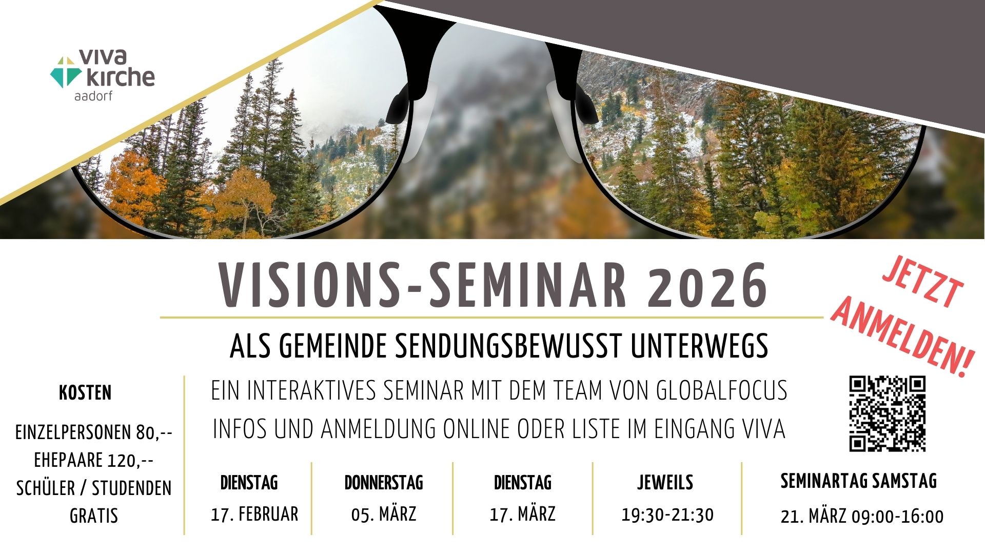 Je mehr dabei sind, desto besser wird es für unsere ganze Gemeinde. Daher bieten wir das Seminar zu einem günstigen Preis an: Verdienende 80,–SFR, Ehepaare 120,–SFR, Nicht-Verdienende (Schüler, Studenten) gratis!